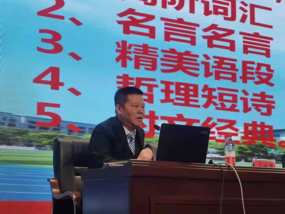 講座伊始,主持人劉滿和副校長向全體師生介紹了本次講座的主講人馬繼德老師:馬繼德老師是長郡中學特聘高中語文研究員,長郡中學清北班培訓專家,組大組長,省、市高級教師評審專家庫評委。1994年、1997年先后被市級、省級職稱評審委員會破格晉升為中學一級、中學高級語文教師,是長沙市2010年首批晉升的中學五級教師。曾獲創新杯及葉圣陶杯全國一等獎優秀指導教師、市級教學比武一等獎、市級十佳教師、縣級勞動模范等榮譽,是全國及省中語會授予的作文教學優秀教師。在省級、國家級報刊上公開發表論文數十篇,有省級一等獎結題課題,撰寫高考輔導書籍二百萬余字。近幾年在安徽、江西、湖南、廣東、廣西、湖北等省市縣完成高考備考講座百余場,應邀在懷化、婁底、郴州、岳陽、常德、邵陽、永州、湘西、長沙、玉林、柳州、池州、荊州、赤壁、武漢、湖南師范大學等地完成市級、省級教師培訓或高三復習研討會講座30余場。每一種卓越身份,每一項高光榮譽,每一個沉甸甸的成就,都昭示著這場講座的含金量。在熱烈的掌聲中,身著正裝、神采飛揚、風度翩翩的馬老師開始為時兩個小時的講座。