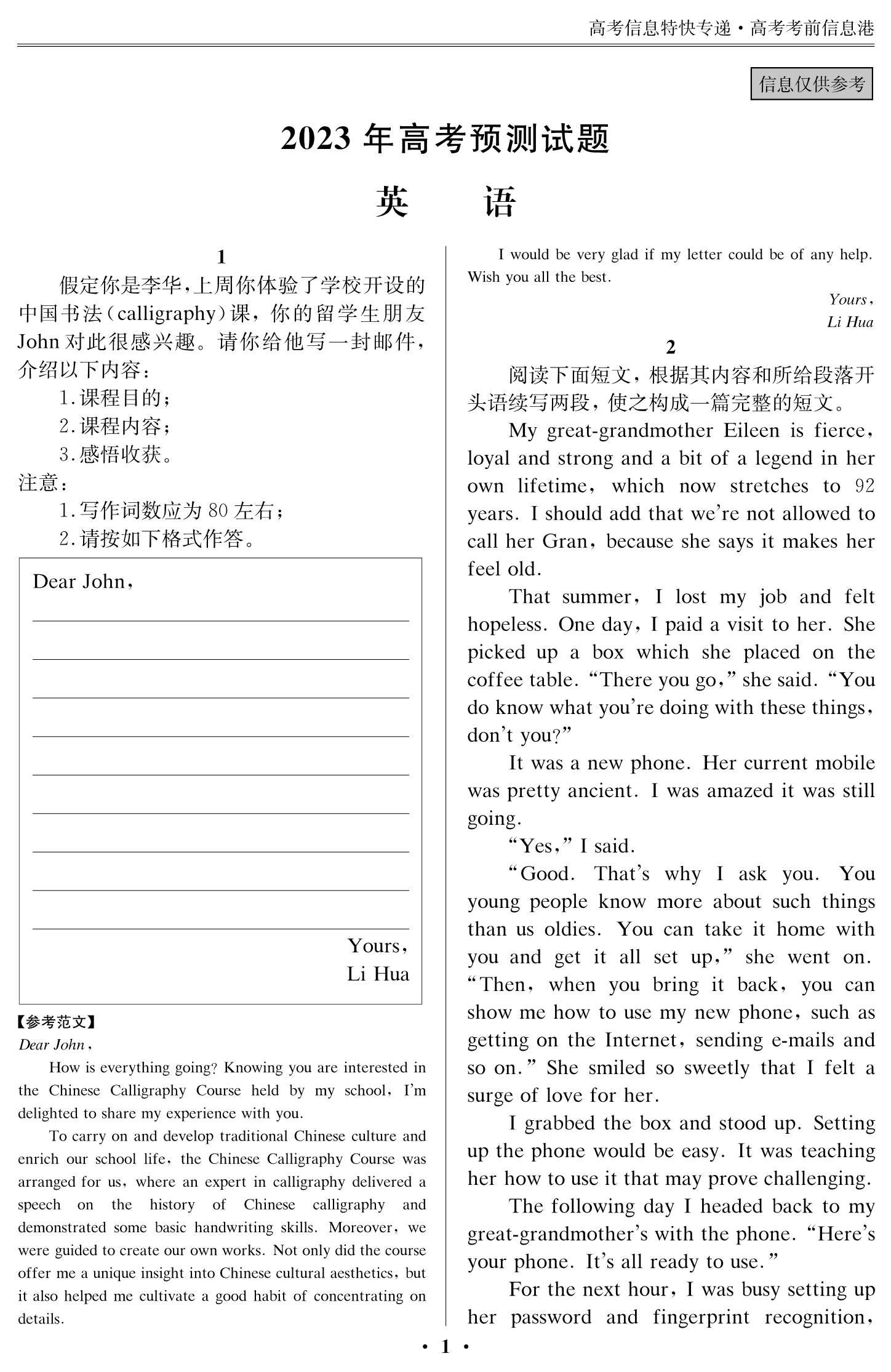 2023年高考考前預(yù)測(cè)信息補(bǔ)充內(nèi)容(一)5月30日