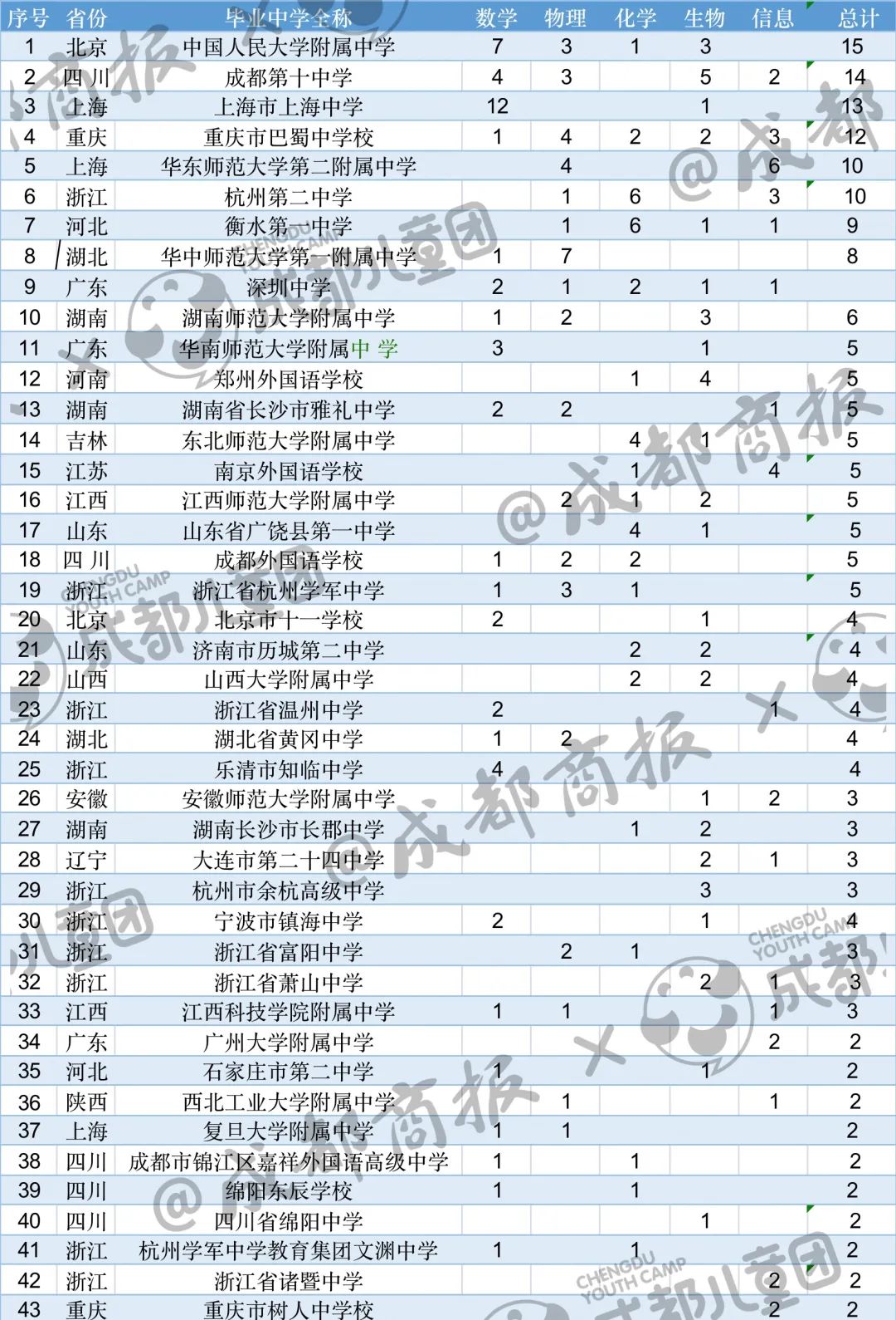 第二名是成都市第七中學,各學科金牌分布都比較平均,學生發揮非常平穩。
