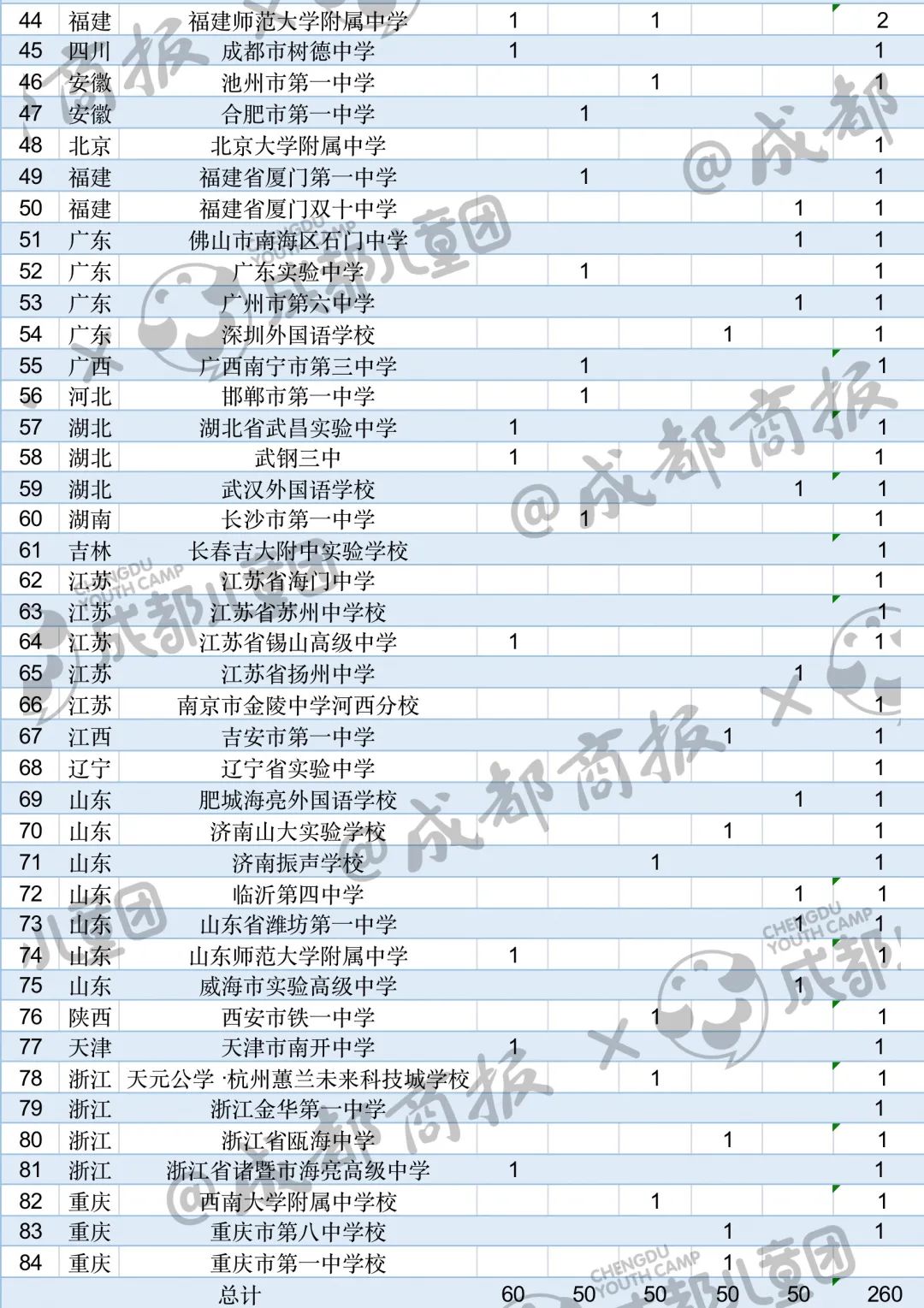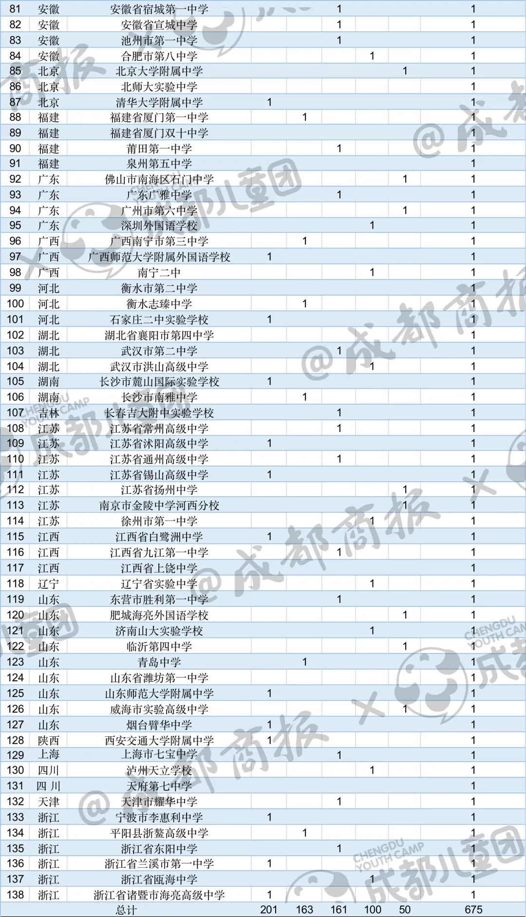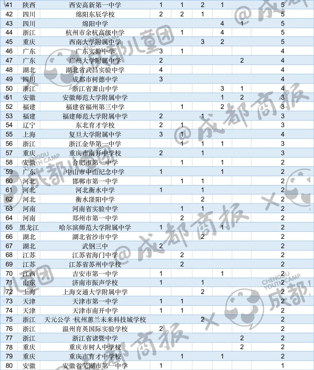我們也單獨找出了四川的數據,2022年,入圍“國集”的達到了26人,比去年增加9人,來自成都第七中學校、成都市樹德中學、成都外國語學校、成都市錦江區嘉祥外國語高級中學、綿陽中學、綿陽東辰學校等。