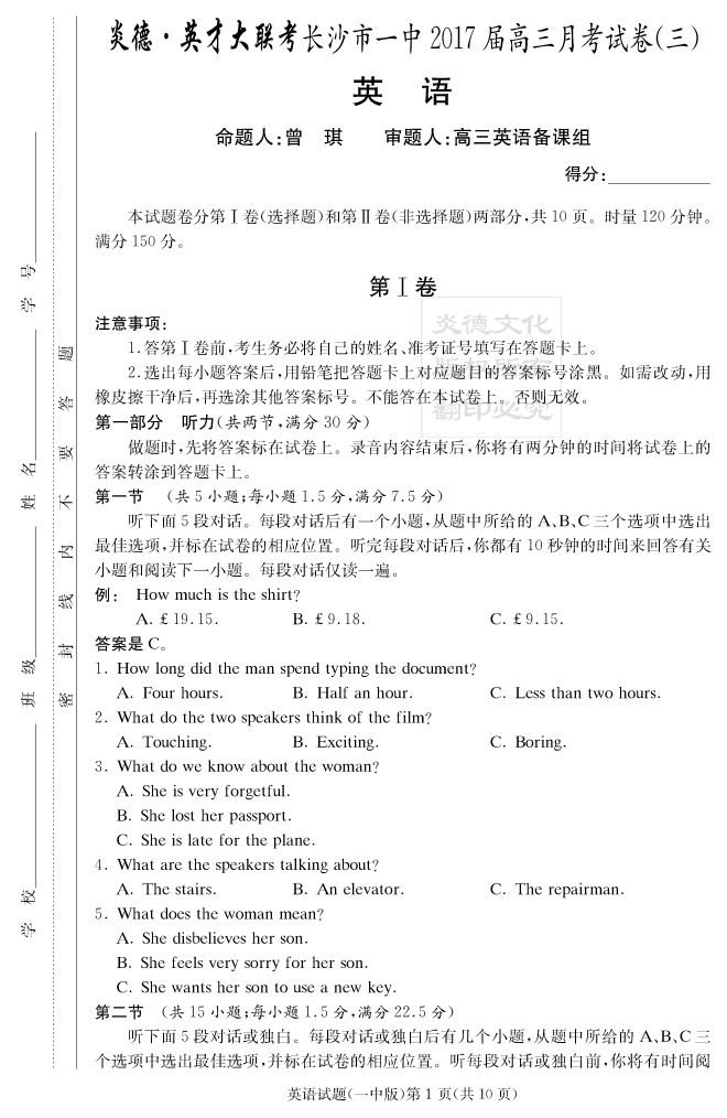 【英語(yǔ)】炎德英才大聯(lián)考2017長(zhǎng)沙一中高三3次月考