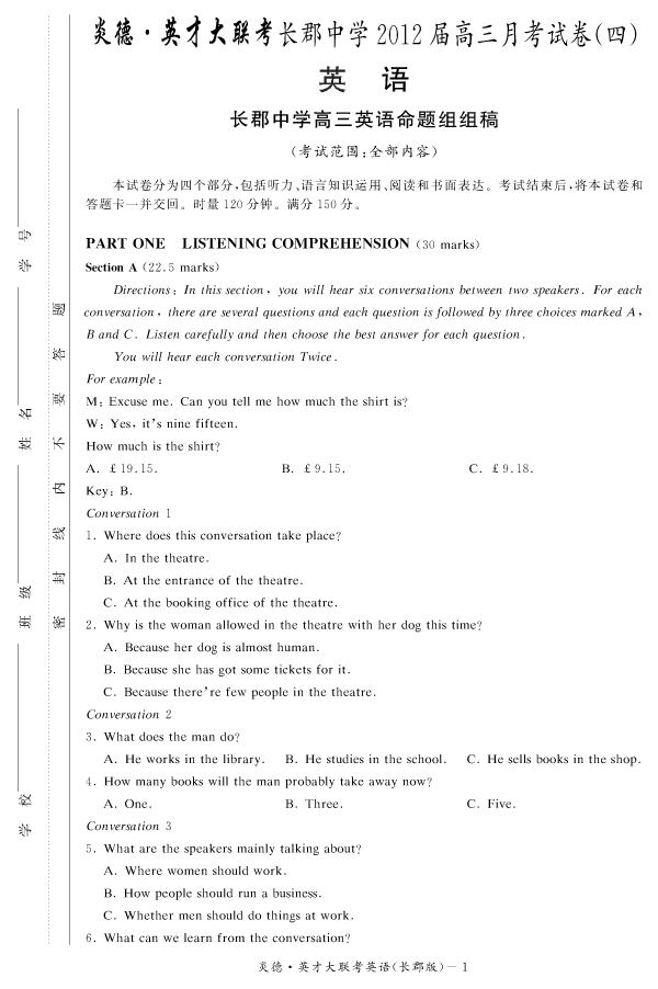 【英語】炎德英才大聯(lián)考2012長郡中學(xué)高三4次月考